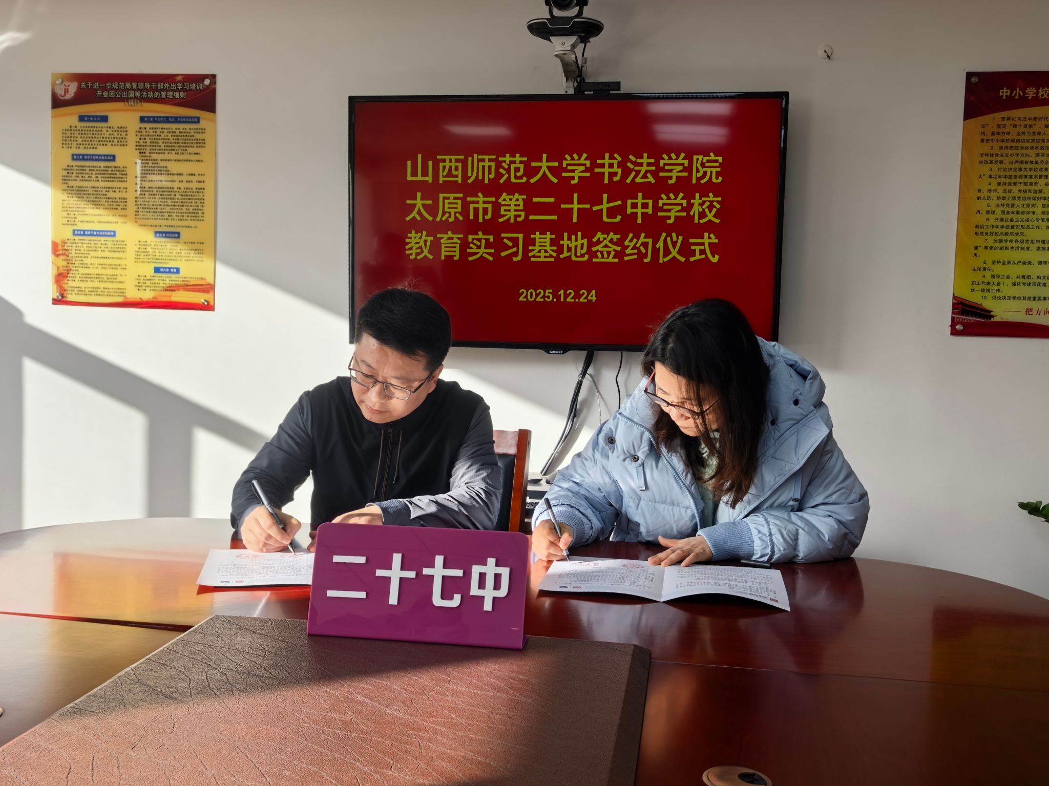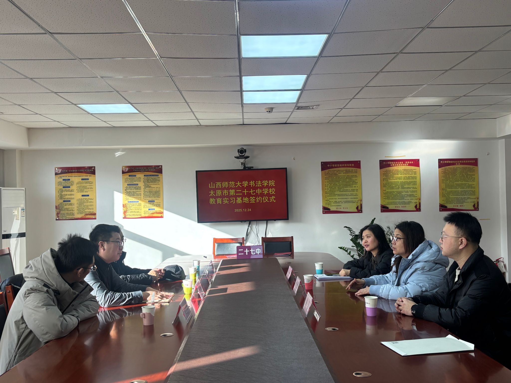 院长曹亚彬、教育实践部主任邢晓波、办公室主任王文清、办公室干事赵蓉一行前往太原市第二十七中学校举行了教育实习(实践)基地签约仪式。太原市第二十七中学校校长刘君、副校长武捷、书法学科带头人韩嘉出席仪式。