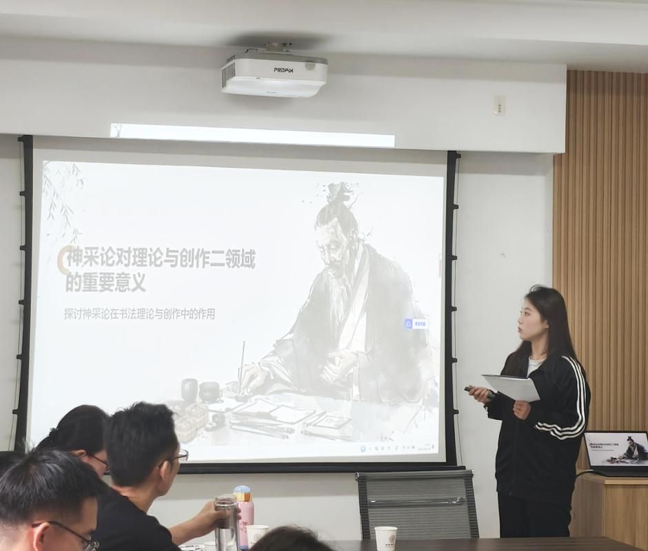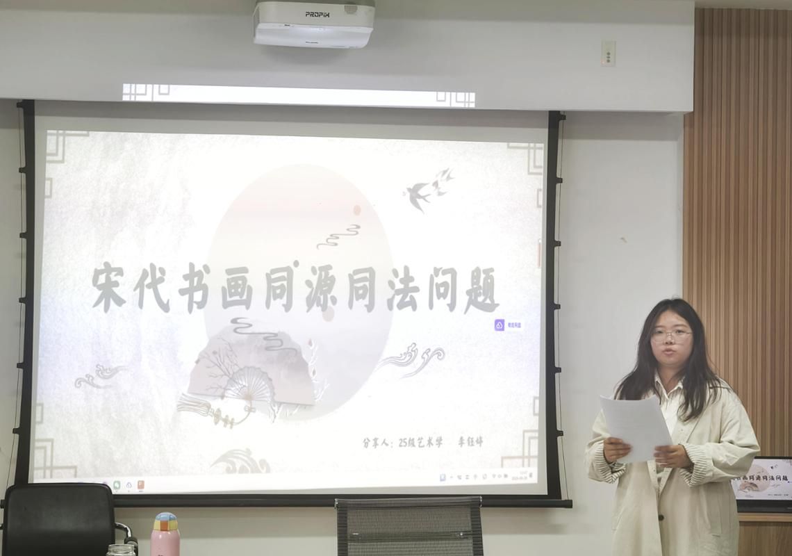 在学生分享环节,六位同学结合研读经典,多维度解读书法文化。张艳芳同学以《与书法相伴的生活》为引,分享从初识书法到领悟其为“生活方式与修行”的心路历程,还结合祝允明《晚间帖》、张大千书法菜单等案例,提出了“书法可融入日常交流”的独特见解;范雪娥同学围绕《战国书法研究》,系统梳理了简牍帛书的形制、构图与装饰特点,辅以实物图片,让在场师生直观感受了战国书法的多样性;张晟源同学依据《中国书画美学史》,从“骨、筋、肉、气”四维解析书法审美标准,并结合王羲之《兰亭序》《丧乱帖》等作品,梳理其历史演变脉络;田沐阳同学围绕《古代字体论稿》,以颜真卿与徐浩的书法实践为线索,探讨了唐代书法在法度严谨中体现的人格力量与时代精神;魏宇华同学深入剖析王僧虔“书之妙道,神采为上”美学思想,阐述其对当代书坛重形式轻内涵现象的反思与启示;李钰婷同学结合《中国美术史》,围绕“书画同源同法”议题,考察了宋代文人画与书法的互渗关系,揭示笔墨背后共通的审美理想。